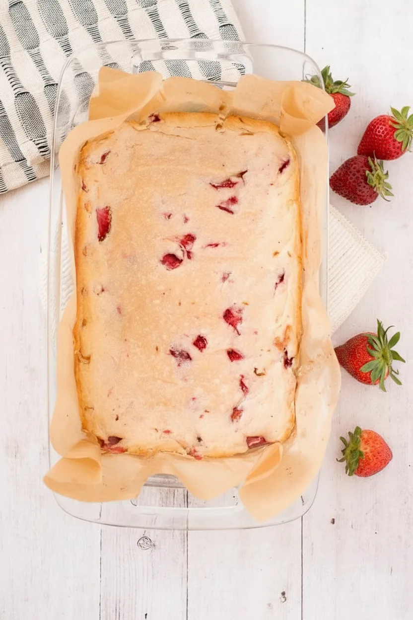 Expand fruit selection by incorporating blueberries raspberries blackberries alongside strawberries. Additionally laying berry compote swirls atop unbaked batter creates marbled effect post-baking.
