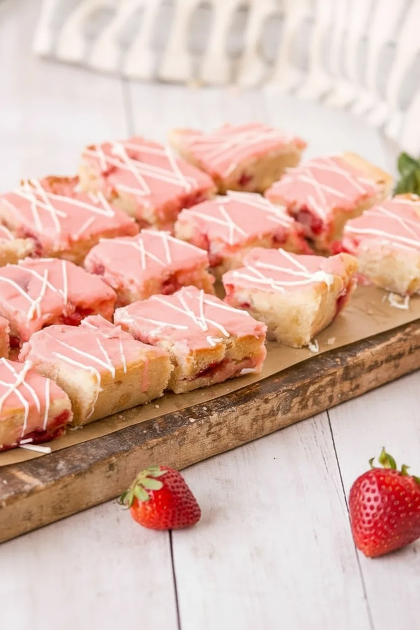 For the strawberry lemon glaze whisk sifted powdered sugar with strawberry puree and lemon juice until silky smooth consistency achieves. Similarly melt white chocolate slowly via double boiler then transfer into piping bags. Drizzle glazes crosswise over cooled blondies allowing it set before slicing. For clean cuts wipe your knife between slices ensuring neat presentation.