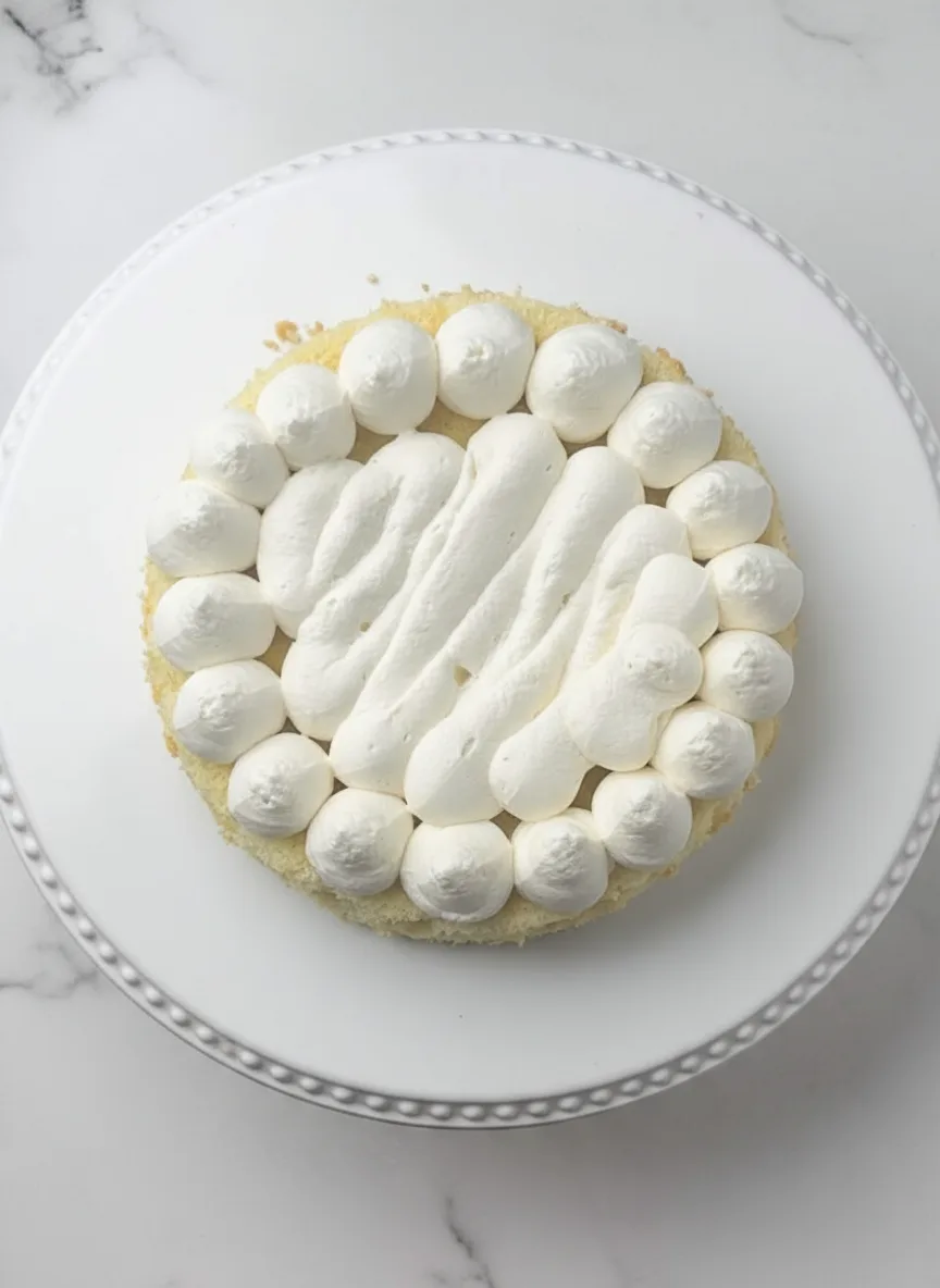 - Place first cake layer on plate. Spread ¾ cup whipped cream over surface.