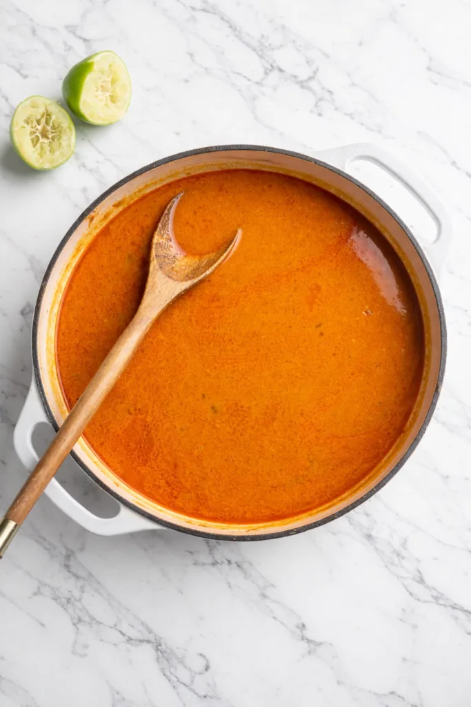 Season the onion mixture with sea salt, black pepper, coconut sugar, and liquid aminos. Stir well to combine. Pour in coconut milk and vegetable broth. Bring the liquid to a boil, then reduce heat to simmer uncovered for 10-15 minutes, stirring occasionally. Squeeze fresh lime juice into the pot and remove from heat.