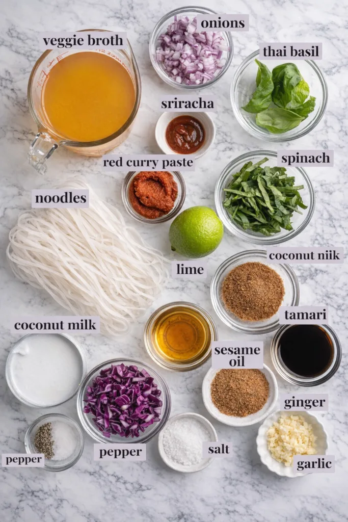 Aromatic Thai coconut curry soup with ginger, garlic and lime in creamy coconut broth. Serve over noodles with fresh herbs and veggies.