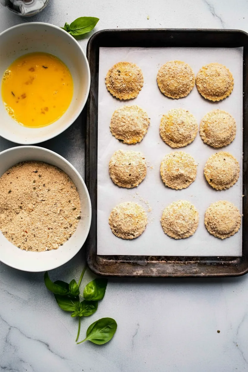 Dip each ravioli in egg mixture, letting excess drip off. Press both sides into bread crumb mixture, ensuring full coverage. Place coated ravioli on a baking sheet in a single layer.
